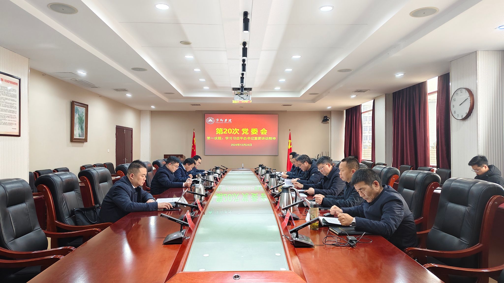12月24日,校党委在至善楼第一会议室召开“第一议题”学习会,集体学习习近平主席向“2024从都国际论坛”致贺信、习近平主席向美中贸易全国委员会2024年度庆典晚宴致贺信、中央经济工作会议在北京举行 习近平总书记发表重要讲话、《求是》杂志发表习近平总书记重要文章《深入推进党的自我革命》、中共中央举行纪念乔石同志诞辰100周年座谈会 习近平总书记发表重要讲话、习近平总书记在听取海南省委和省政府工作汇报时发表重要讲话、习近平总书记对做好“三农”工作作出重要指示、习近平总书记出席澳门特别行政区政府欢迎晚宴并发表重要讲话、习近平总书记在庆祝澳门回归祖国25周年大会暨澳门特别行政区第六届政府就职典礼上的讲话、习近平总书记在视察驻澳门部队时发表的重要讲话等。学习会由校党委书记邱晓辉主持。