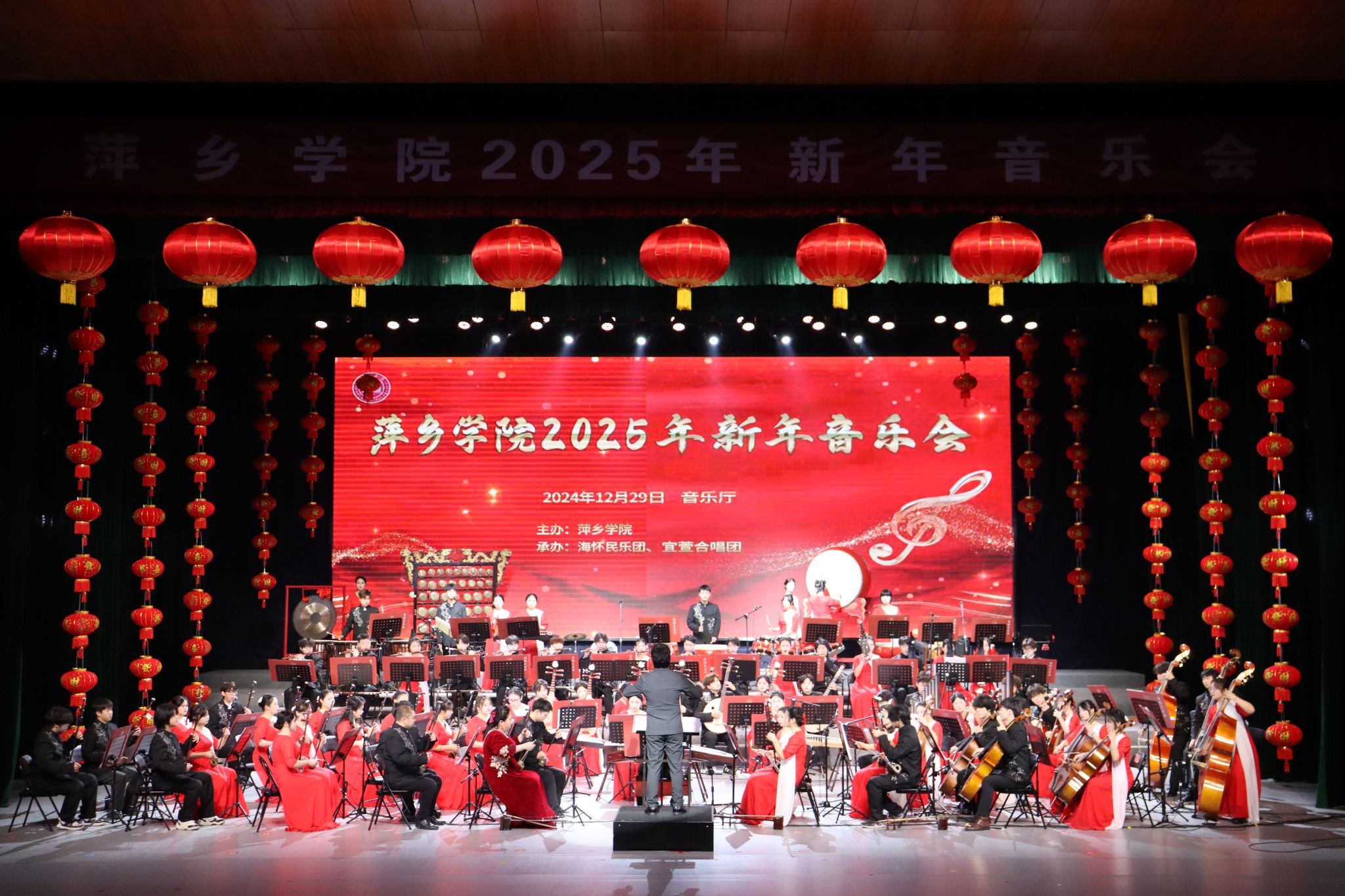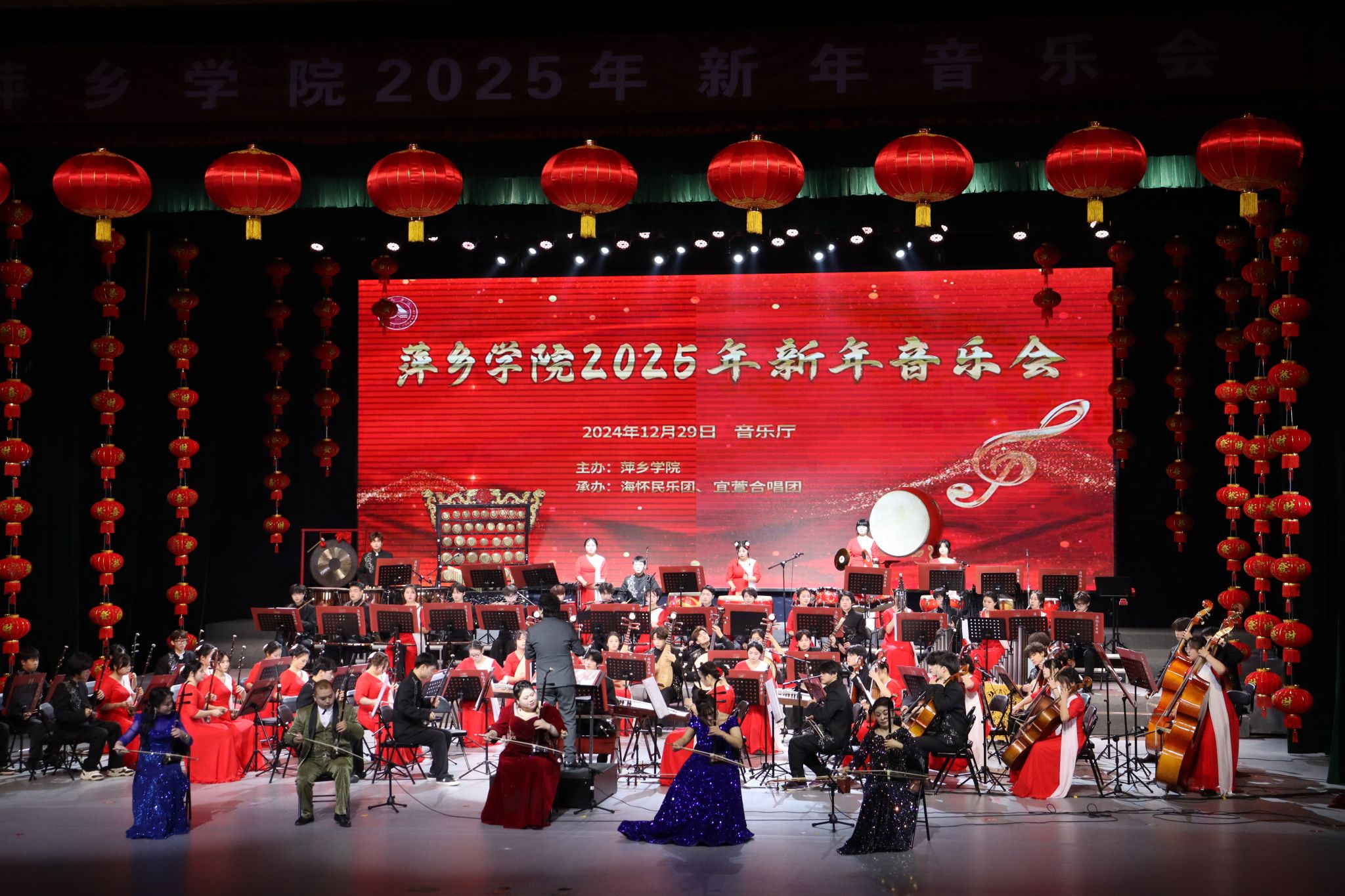 本场音乐会由艺术学院携手海怀民乐团、宜萱合唱团及优秀师生共同演绎,共同为新年奏响雄浑壮阔的乐章。海怀民乐团《春华秋实》、《龙腾虎跃》、《花好月圆》,宜萱合唱团《回家》、《我喜欢》等优秀作品都表达了对于美好生活的向往和浓浓的家国情怀。