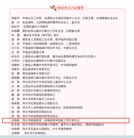 近日,萍乡市举行庆祝第112个“三八”国际劳动妇女节主题活动,对2021年度萍乡市三八红旗手(集体)进行表彰,beat365官网初等教育学院教师徐海燕荣获“萍乡市三八红旗手”荣誉称号。
