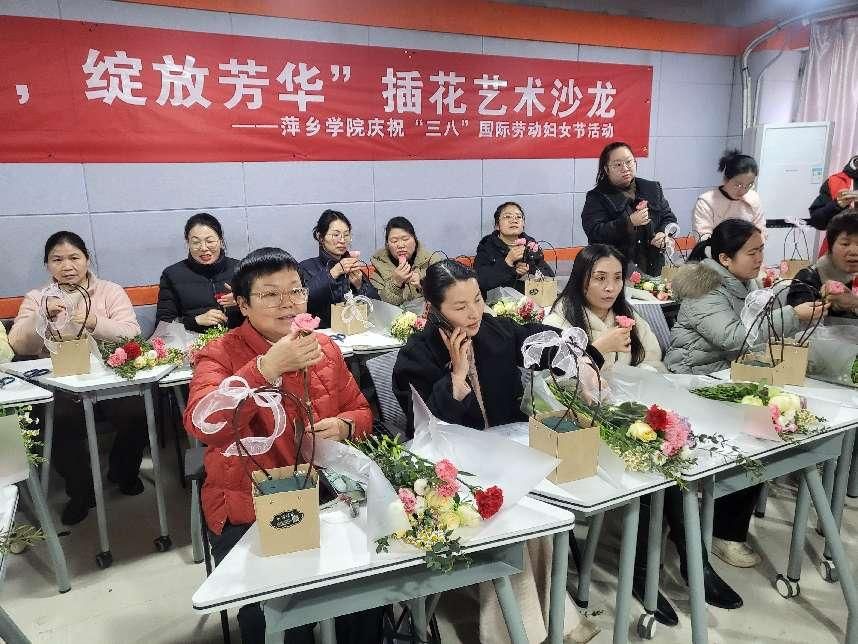 活动现场花香四溢,气氛热烈。来自全校各学院、部门的50余名女教职工齐聚一堂,在专业花艺师的指导下,将玫瑰、康乃馨、洋桔梗等鲜花精心搭配,创作出一个个错落有致、生机盎然的花艺作品。每一件作品都凝聚着女教职工们对美的追求和对生活的热爱。