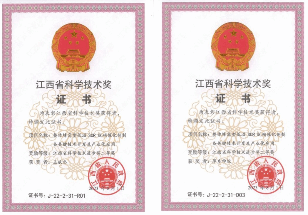 王献忠教授获得2022年度江西省科学技术奖二等奖,项目名称《整体蜂窝型低温SCR脱硝催化剂制备关键技术开发及产业化应用》