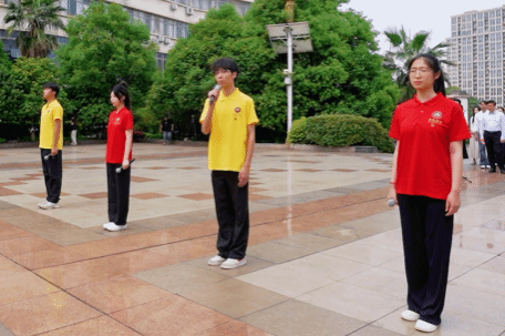 国旗护卫队队员擎着鲜艳的五星红旗,迈着铿锵有力的步伐入场。伴着激昂的《义勇军进行曲》,五星红旗冉冉升起,全场师生齐声高唱国歌,行注目礼。