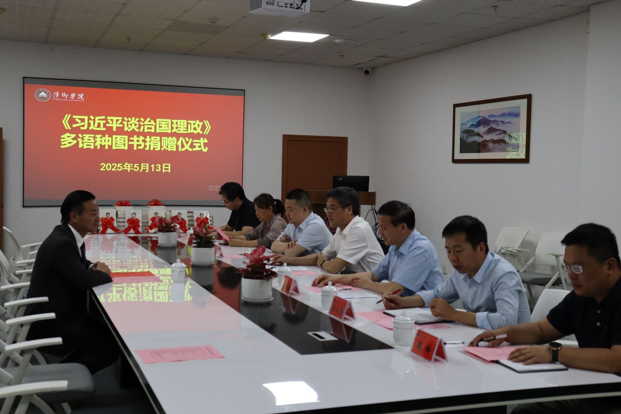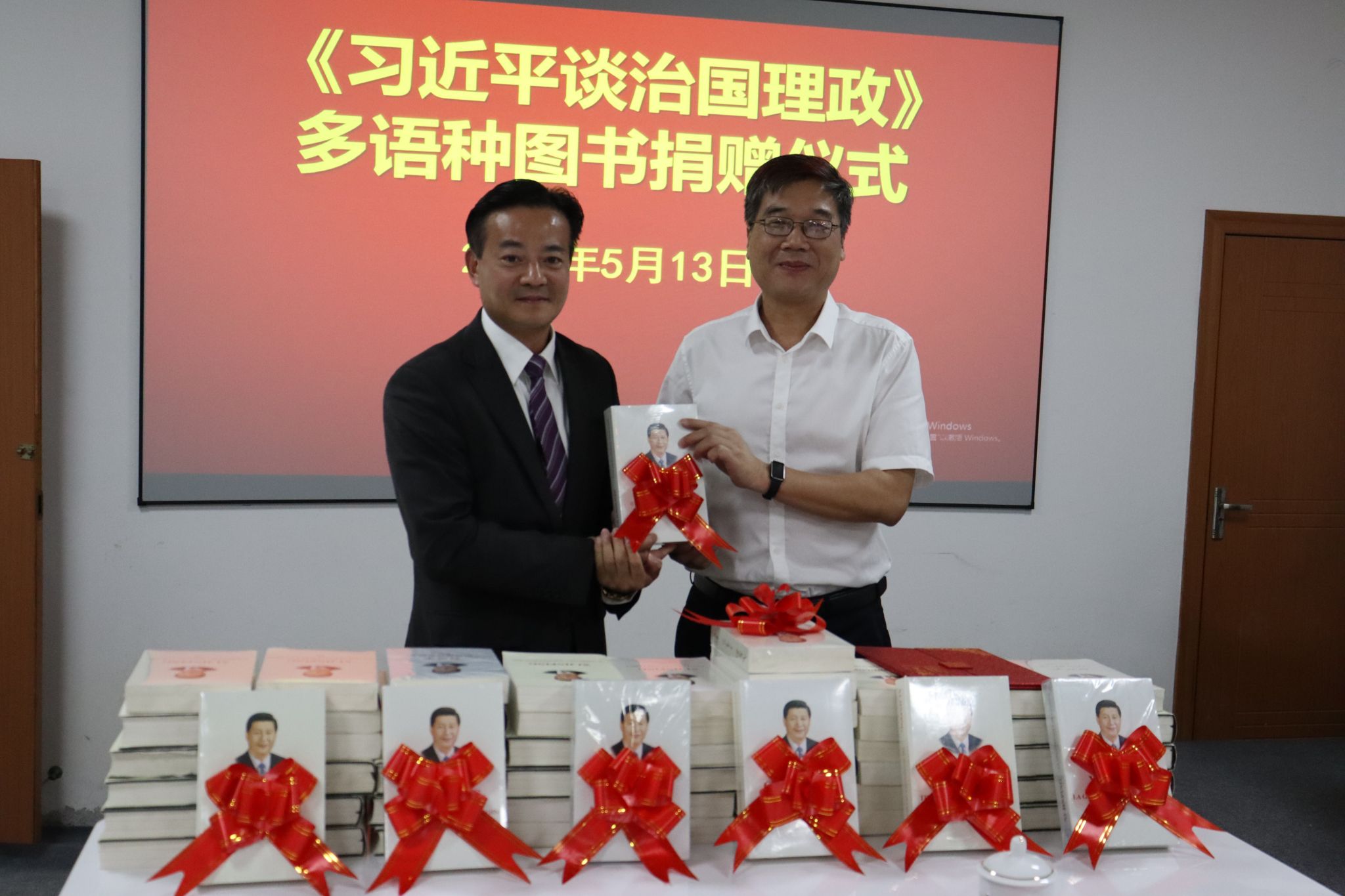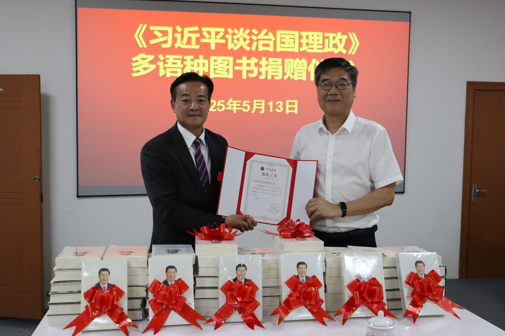 5月13日,《习近平谈治国理政》多语种图书捐赠仪式在beat365官网图书馆二楼会议室举行。北京崇学文化发展有限公司总经理余富文,校党委书记邱晓辉等领导出席捐赠仪式。校党委委员、副校长陈永国主持捐赠仪式。邱晓辉代表学校向余富文先生颁发捐赠证书。学校党政办公室、党委宣传部、马克思主义学院、国际教育与交流中心、图书馆等部门负责人共同参加捐赠仪式。
