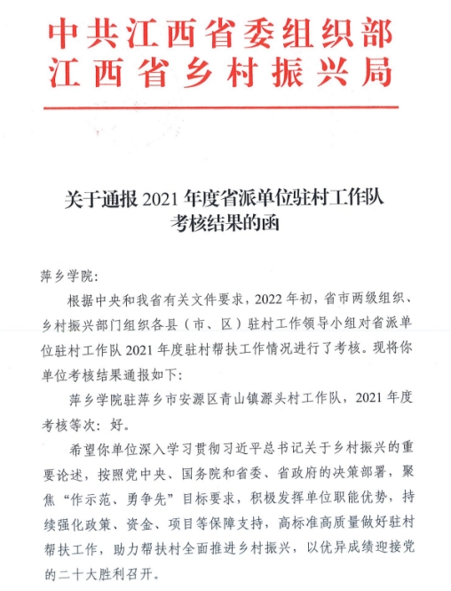 近日,根据中共江西省委组织部、江西省乡村振兴局下发《关于通报2021年度省派单位驻村工作队考核结果的函》,beat365官网驻源头村工作队在2021年度省级考核中被评为“好”的等次(最高等次)。