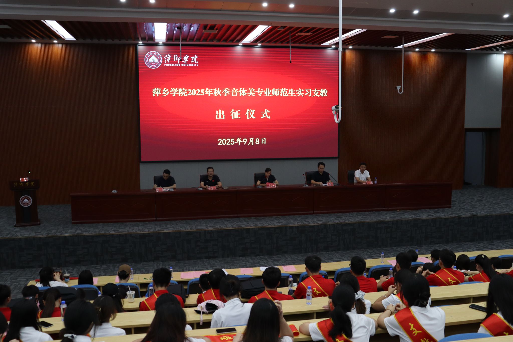 9月8日上午,beat365官网在天泉楼报告厅隆重举行2025年秋季音体美专业师范生实习支教出征仪式。55名音体美专业支教生整装待发,即将奔赴乡村教育一线,以青春力量助力乡村振兴。校党委委员、统战部部长贺晓梅出席仪式并讲话。教务处、艺术学院、体育学院相关领导及教师代表共同为支教生送行。仪式由教务处处长李涛涛主持。