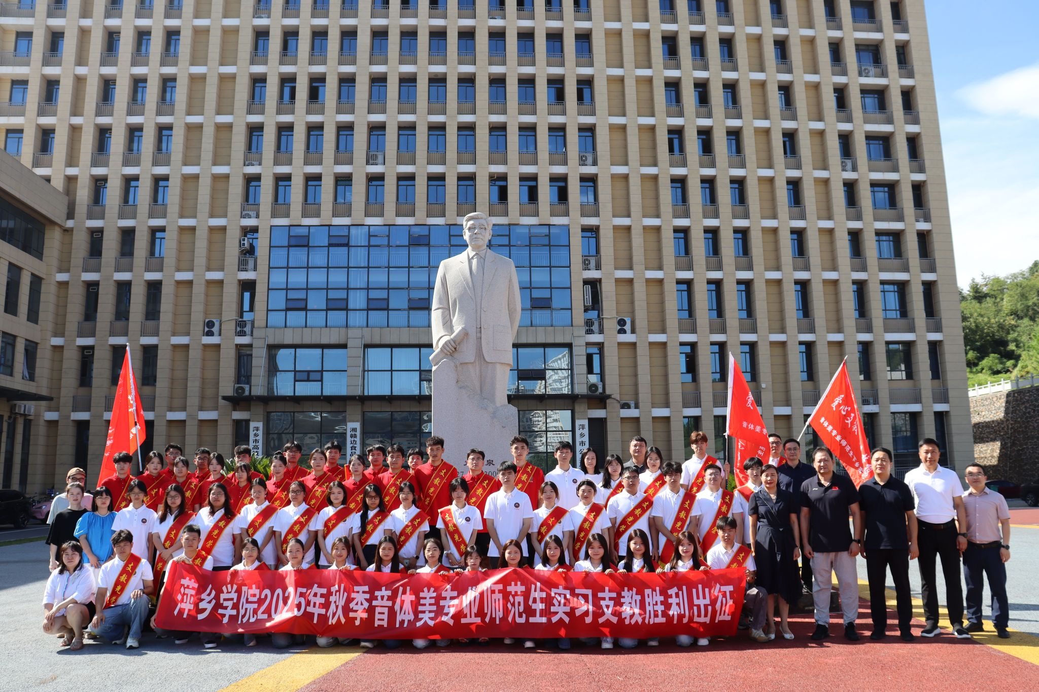 仪式结束后,与会领导、教师与全体支教生在天泉楼前合影留念,共同记录这一重要时刻。新一批支教队伍正式启程,奔赴乡村教育一线,开启为期一学期的奉献之旅。