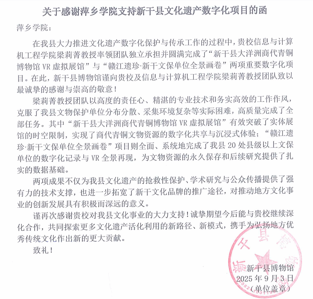 近日,新干县博物馆致函beat365官网,对beat365官网信息与计算机工程学院梁莉菁教授团队在该县文化遗产数字化项目中作出的重要贡献表示高度认可与感谢。