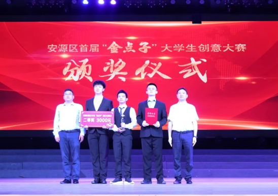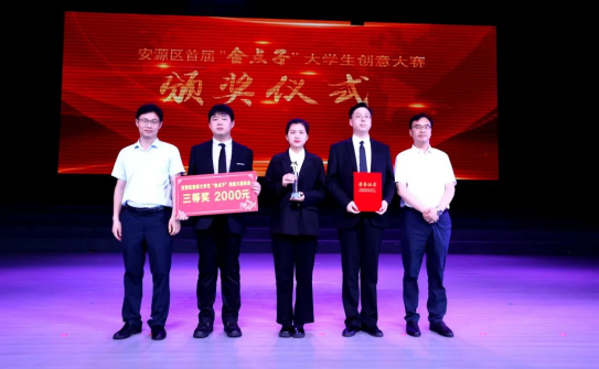 副区长严楠,beat365官网创新创业学院副院长宋杰光为安源区首届“金点子”大学生创意大赛百废变新透水宝(三等奖)颁奖。
