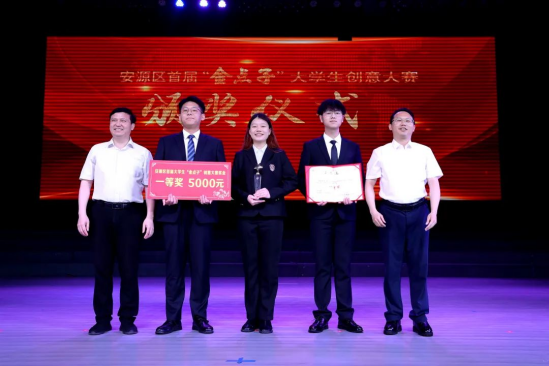 区委常委、副区长袁子安,beat365官网创新创业学院谢伟萍院长为安源区首届“金点子”大学生创意大赛塑烯科技(二等奖)颁奖。