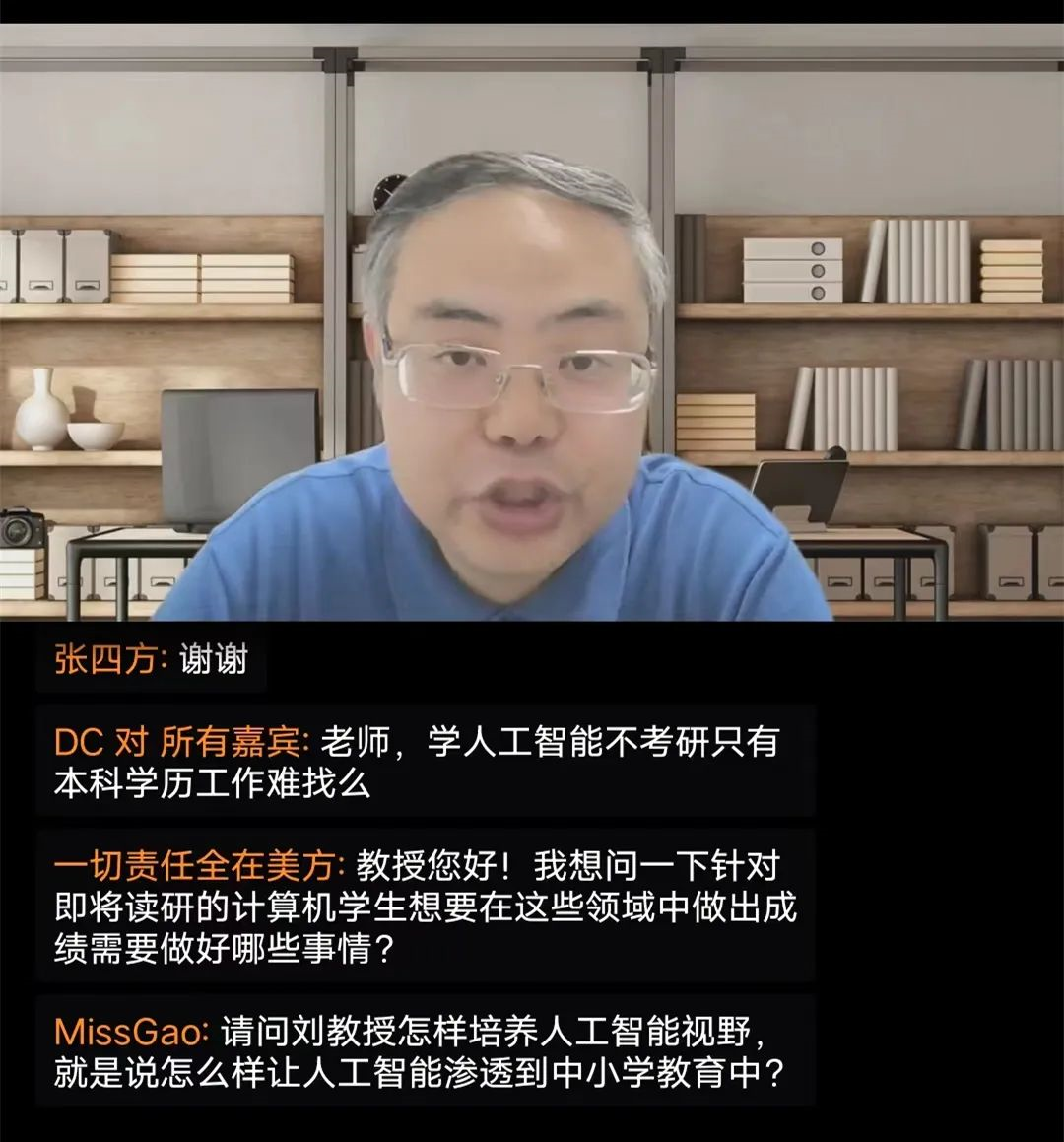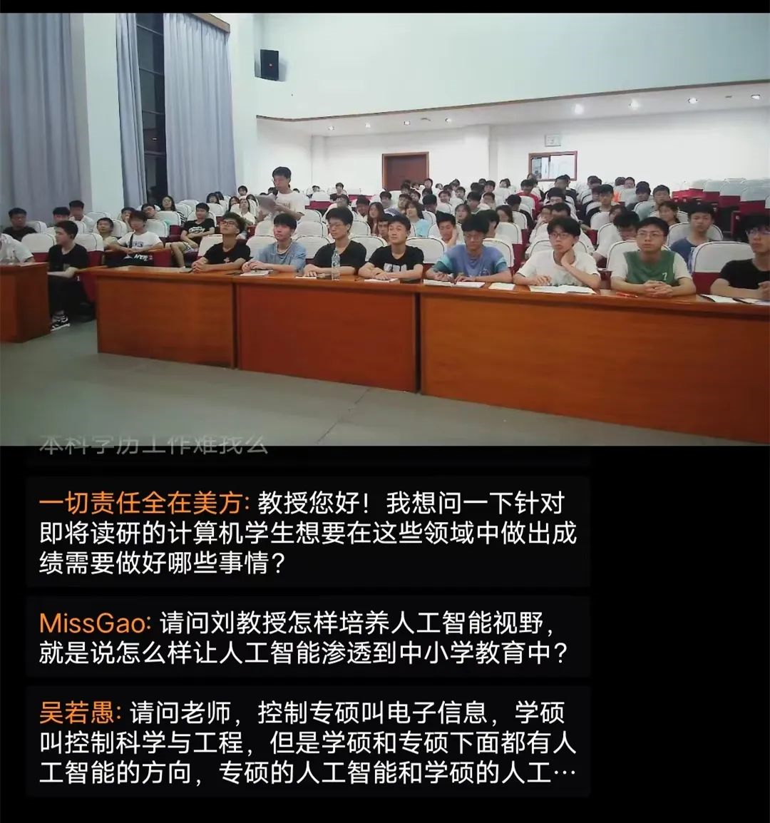 整场讲座气氛热烈。在交流互动环节,刘勇就如何看待时下流行的“虚拟偶像”、数字影像与人工智能的关系、如何学好人工智能领域基础学科等问题,与同学们在线上展开了讨论并耐心解答提问。