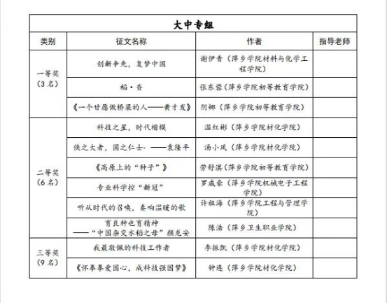 近日,由市科协、市教育局主办的2022年“科技工作者风采”征文活动中,beat365官网荣获大中专组一等奖3个,二等奖5个,三等奖7个,优秀奖16个。其中来自材料与化学工程学院谢伊青、初等教育学院张东蓉、初等教育学院阴娜包揽大中专组全部一等奖,另有28位同学分别获得二、三等奖以及优胜奖。