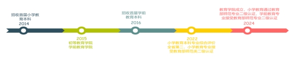 学院现有小学教育(小学语文方向、小学数学方向、小学科学方向)、学前教育2个本科专业招生,两个专业均为学校特色专业。小学教育专业2014年开始招生;2016年学前教育本科专业开始招生。小学教育专业2022年本科专业综合评价全省排名第二,小学教育专业2024年通过教育部师范专业二级认证;学前教育专业2025年通过教育部师范专业二级认证。教育学院现被列为学校教育硕士点建设单位。