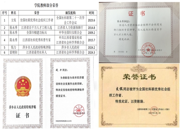 现有教职工67人,其中教授5人,副教授12人,博士12人,具备海外教育背景教师9人,双师型教师42人,硕士及以上学历教师占比95.52%。教师队伍先后荣获“全国社联优秀社会组织工作者”“江西省百千万人才工程省级人选”“全国巾帼建功标兵”“江西省社科优秀科普专家”“萍乡市政府特殊津贴专家”“江西省最美社科人”等荣誉称号。近年来,承担国家社科基金项目2项、国家自科基金项目1项。
