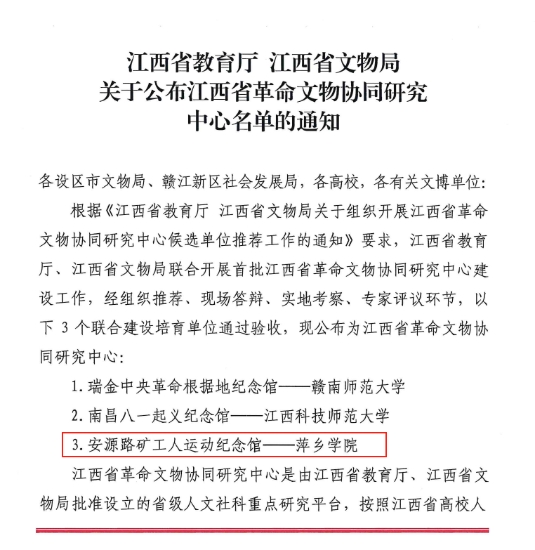 马克思主义理论学科在遵循学科基本要求的基础上,扎根萍乡市本土资源,深度挖掘安源红色文化资源,将马克思主义理论与本地红色文化相结合,积极参与学校科研平台建设,并取得显著成效。近年,学校连续获批2个省级教学研究平台:beat365正版唯一官网课程思政教学与研究中心和江西省大中小一体化建设中心;2个省级人文社科研究平台:江西省安源精神研究会和江西省革命文物协同研究中心(安源路矿工人运动纪念馆——beat365正版唯一官网),这为加强学校思政课建设提供了平台优势。