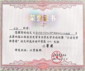 13 | 2025年4月 | 周于琪 | 第四届江西省历史专业学生学术论坛暨“江右史学新秀奖”论文评选活动一等奖 | 省级 |