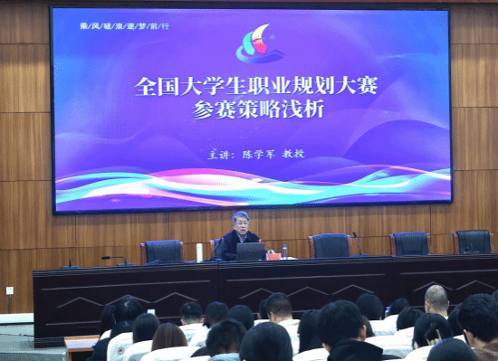 讲座以“乘风破浪,逐梦前行”为主题激昂启幕。陈学军教授从宏观视角梳理了全国大学生职业规划大赛的发展脉络与核心价值。他表示,该赛事作为深化高等教育改革、推进就业育人融合的重要载体,已成为大学生展示自我潜能、锚定职业方向的优质平台。