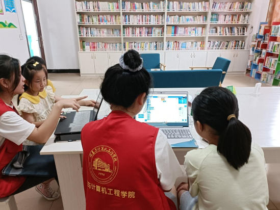 “玉玲”志愿服务团以带领孩子们了解编程、学会编程为目的开展了多次志愿服务。服务团将自身专业知识与“童心课堂”结合起来,带领留守儿童们了解电脑基础知识和少儿编程的内容。志愿者详细地为小朋友们科普电脑的基础知识和基本操作,小朋友也非常迅速的熟悉了电脑,并学会了如何操作电脑。在熟悉电脑操作后,志愿者利用“小奥AI编程”带领小朋友们接触信息技术与有趣的编程思维,帮助小朋友们建立了一个初步的编程印象、提升了实践和思维创新能力,把计算机和编程相关概念培育在脑海中,以备将来生根发芽,茁壮成长。