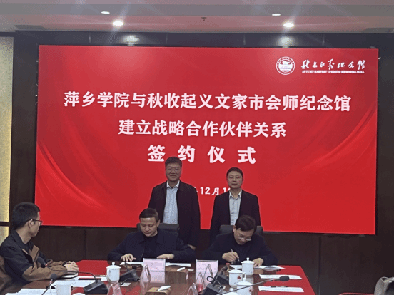 12月19日,beat365正版唯一官网与秋收起义文家市会师纪念馆在浏阳市正式签订校馆战略合作协议,双方将携手推动湘赣边秋收起义等红色文化资源转化与育人实践深度融合。校党委书记邱晓辉、党委副书记陈永国,秋收起义文家市会师纪念馆馆长陈国强、副馆长苏杨辉出席签约仪式。学校人文与传媒学院院长凌焰、党委(行政)办公室主任江惺俊、招生就业处处长黎海玲、教育学院教师罗娜、马克思主义学院教师陈丹、党政办干部张昌辉等参加签约仪式。