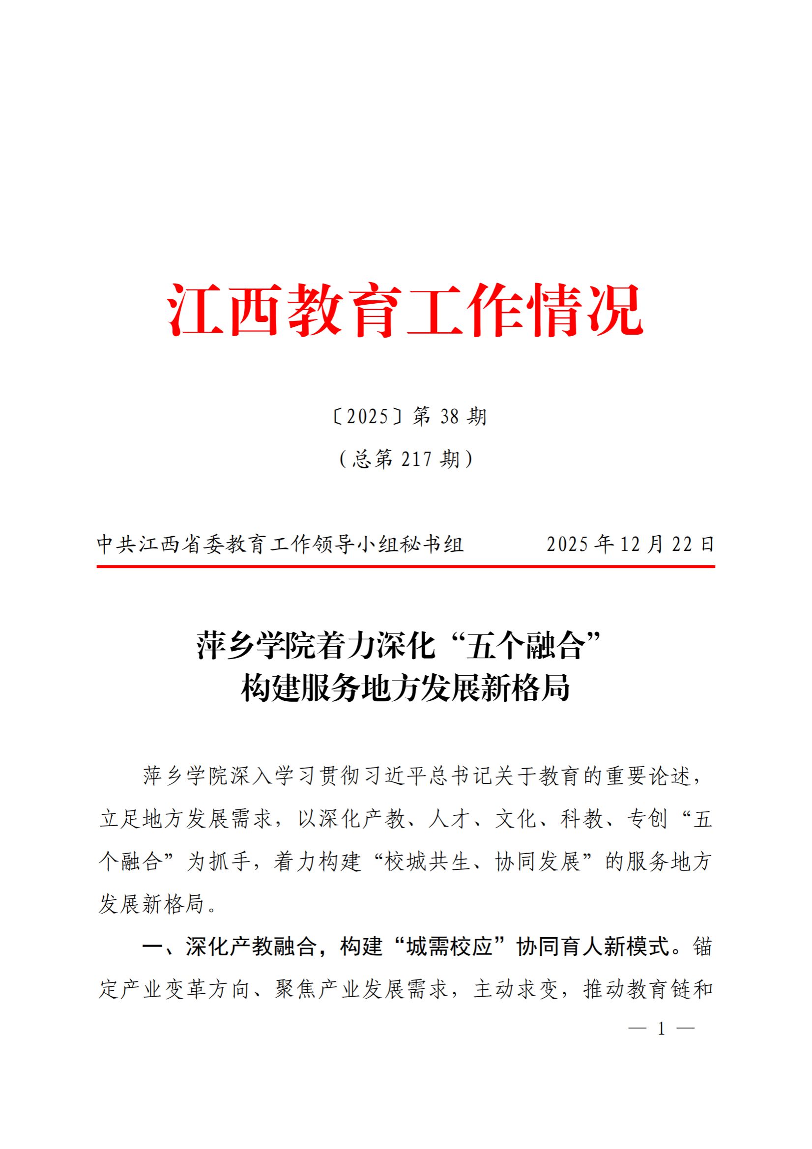 《江西教育工作情况》刊登《beat365正版唯一官网着力深化“五个融合”构建服务地方发展新格局》简报,向全省推介beat365官网“校城共生、协同发展”服务地方典型经验。