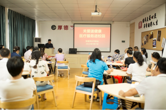 本次活动面向教师和学生分别设健康讲座和免费体检两个环节。健康讲座专家团队由民盟市委会副主委、市人民医院副院长、肝胆外科专家黄文峰带队,5位医疗专家为beat365官网教师代表就常见病的防治进行了互动交流,市医院呼吸与危重症科主任董利民和市医院神经内科副主任医师罗尔敏分别为大家作主题为《肺癌早期甄别与处理》和《早防早治,远离卒中》的健康讲座。