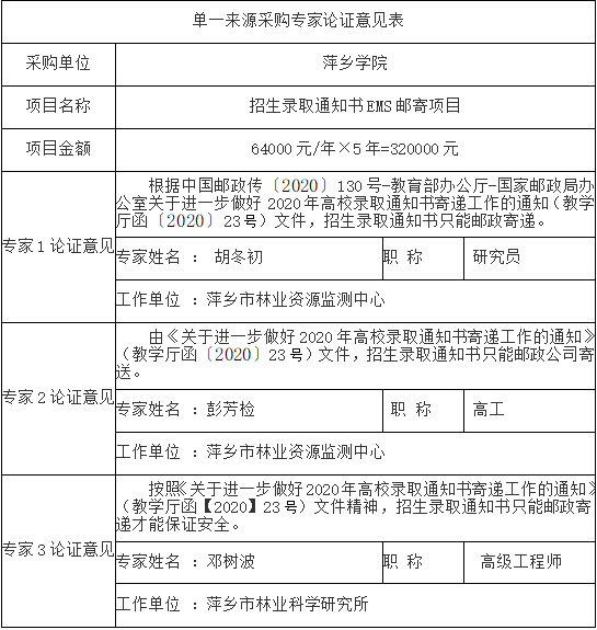 招生录取通知书EMS邮寄项目采用单一来源方式采购,该项目拟由中国邮政速递物流股份有限公司萍乡市分公司提供服务,现将有关情况向潜在政府采购供应商征求意见。征求意见期限从2021年 04月 29日起至2021年04月 30日止。潜在政府采购供应商对公示内容有异议的,请于公示期满后两个工作日内以实名书面(包括联系人、地址、联系电话)形式将意见反馈至beat365正版唯一官网招标与采购中心(联系电话:0799-6682697, 地址:江西省萍乡市萍安北大道211号),联系人:彭老师,联系电话:0799-6682697)。
