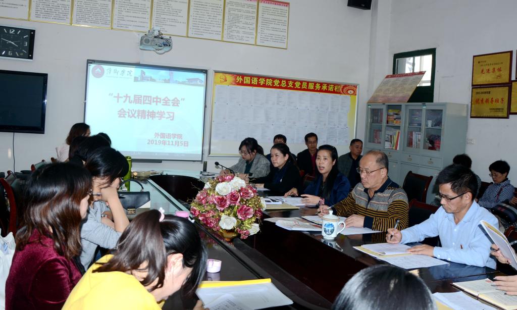 11月5日下午,外国语学院召开全院大会议,传达学习贯彻党的十九届四中全会精神。党总支书记黄柏萍主持会议,带领全体教职工学习贯彻党的十九届四中全会精神。