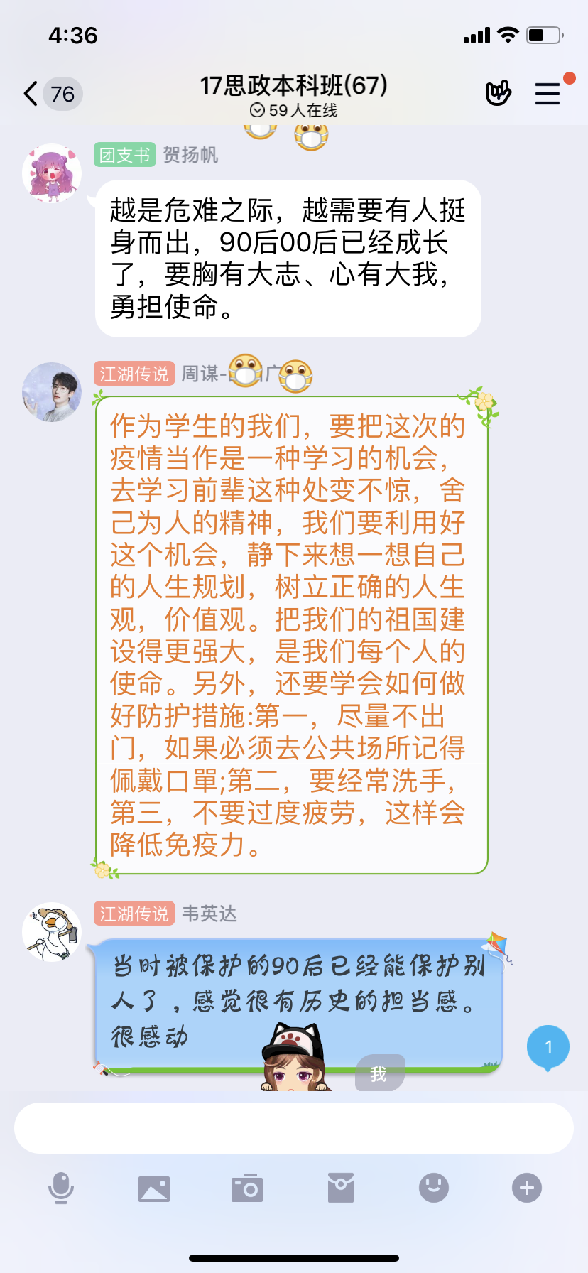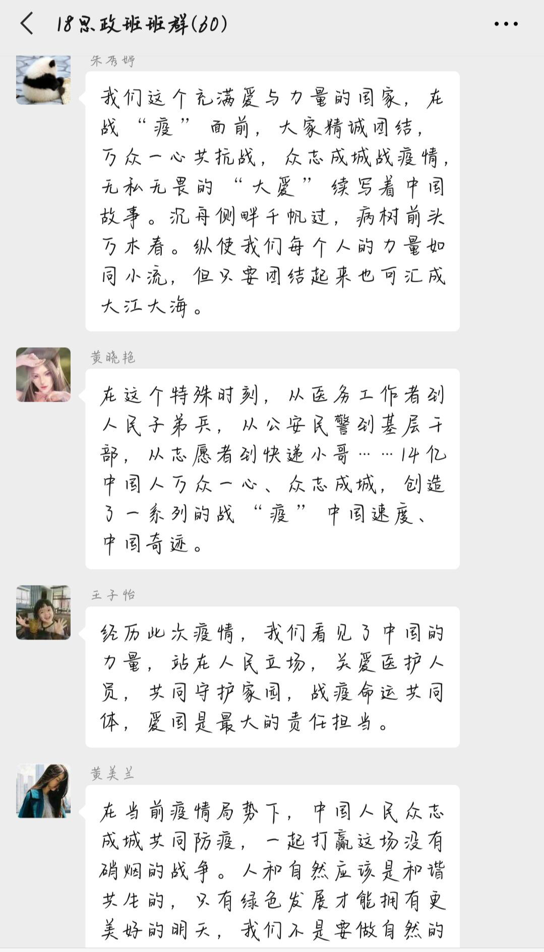 19思政常玉珍:山川异域,风月同天。这一场战斗是人类共同的战役,中华民族依然屹立,在伟大的中国共产党领导之下,敢于面对短板和不足,从中吸取经验教训,在具有新的历史特点的伟大斗争中,我们每一个人要为中华民族伟大复兴作出更大的贡献,让中华民族为世界树立典范。作为青年,拥有着担当,我们不应辜负这伟大的时代,在这场疫情大考中,不仅仅要响应国家号召,更要抓住这次机会让自己成长,从各个方面学习到更多,做更有利于自己、更有利于家庭、更有利于学校、更有利于社会的青年!