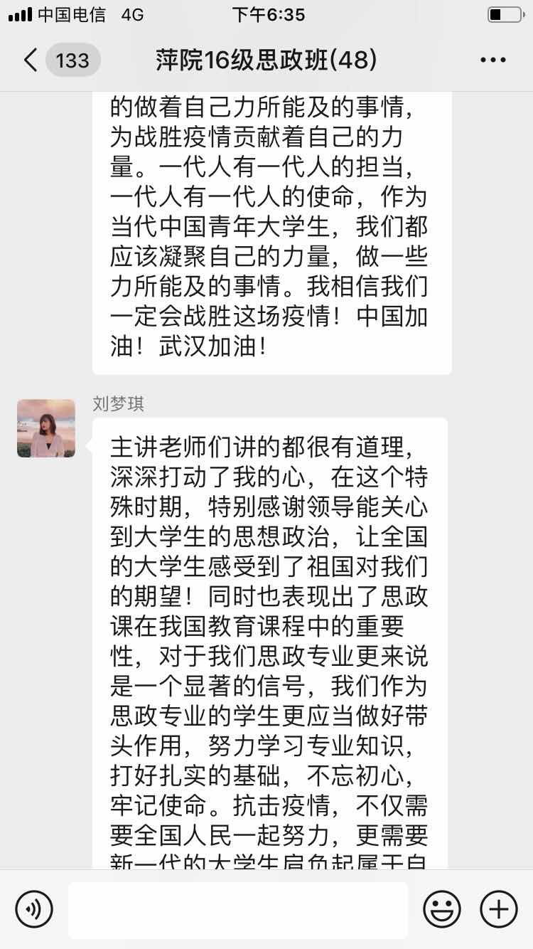 16思政廖玉林:疫情防控思政课,让我明白了许多道理。深刻理解了少年强则国强,少年独立则国独立的道理,明白了爱国的意义,明白了青年一代的责任。课后我定会多加总结,时刻关注疫情发展,配合政府工作,不为社会添乱。疫情防治考验着我们,这不是一场医疗人员的战斗,更是全民族的战斗,对抗疫情我们不能心存侥幸,我们唯有众志成城,才能战胜疫情。希望疫情早日结束,全国人民恢复正常生活秩序。