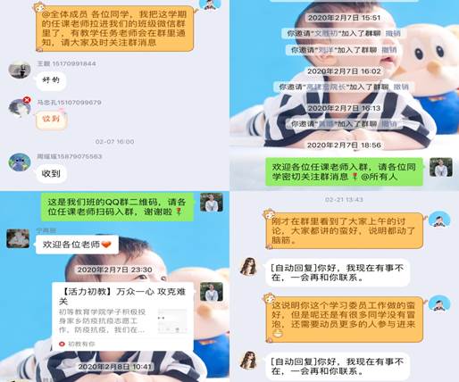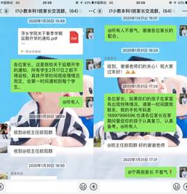 按照学校党委的要求,疫情期间停课不停学,学校也出台了具体的线上教学方案,为了是这一方案更好地落在实处,欧阳群、王欢等辅导员第一时间行动起来了。先帮助每个班级查找他们的最新课表,并将课表发至每一个班级群。同时联系每一位任课老师将他们拉入班级QQ群,微信群。在线上教学过程中,积极与每一位任课老师联系,了解学生的学习情况。课后也会向班级学习委员了解学生的出勤,学习情况,并鼓励学生多参与线上教学互动,多读书,多思考。充分利用这个特殊的寒假,提升自己的综合能力。
