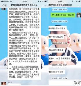 在学校党委的领导下,初等教育学院第一时间成立了防疫工作小组,由分管学院学生工作的党总支书记任组长,学院的辅导员以及所有班主任为成员,积极做好学生疫情防控及返校疫情防控预案工作。在防疫工作小组的领导下,欧阳群、王欢等辅导员每天通过QQ,微信、电话等方式一个个摸查学生的身心情况,做好学生信息摸查与统计工作。坚持每日一报,切实做到疫情防控信息报告及时,联防联控措施启动有效。由于学生不在学校,经常有很多学生不能及时回复信息,电话,欧阳群、王欢等辅导员只能一个个电话联系家长,并时常保持在家长交流群里与家长联系,全面了解学生的动态。