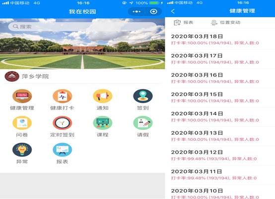 为认真贯彻落实上级对新冠肺炎疫情的防控工作部署,也为便于疫情期间学工线人员有效开展学生健康动态跟踪及防控信息服务等工作,学校推行使用了“我在校园”小程序,要求全校师生每日健康打卡,签到。看似一件很简单的工作,却极其需要耐心。辅导员每日需要发布签到,督促学生签到,健康打卡。学生都在家里,他可能经常不会看手机或者不记得这件事情,系统每天下午18:00就会统计当天数据,这个时候辅导员需要每天进行催促工作。就拿欧阳群所带的班级来说,总共4个班,194人,其中有两个班是毕业班。在一开始每天都有一半以上的学生忘记打卡,甚至有的学生在督促后还是没能完成打卡,每一天,辅导员欧阳群都会因为打卡的事情一直跟几个班主任老师沟通交流,截图让班主任了解具体的情况,在班级群里叮嘱学生签到打健康卡。如果打卡结果中出现了异常,要第一时间与学生取得联系,了解学生的真实情况。在欧阳群等辅导员的耐心叮嘱之下,每日的健康打卡率基本上都能够达到100%,学生也自觉把这件事情当成是每日必做之事,为beat365官网的防疫工作奉献了一份自己的力量。