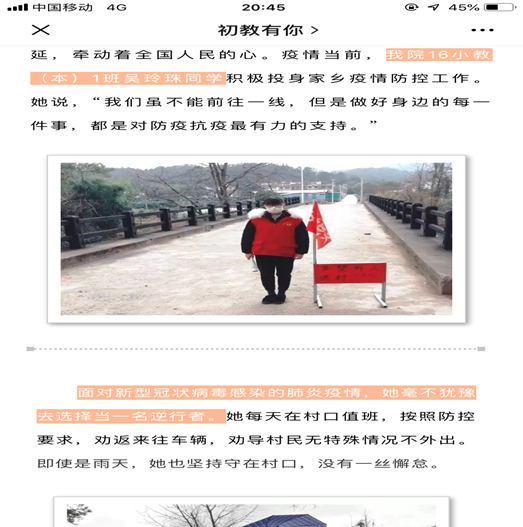 按照学校党委的要求,欧阳群等辅导员通过QQ群、微信群开展了各种形式的防疫主题教育,让每一个学生了解新冠肺炎的基本情况、当前的严峻形势,以及如何做好自我防护的一些方法。学院有一位学生在这期间出现了咳嗽,低烧症状,内心惶恐不安,情绪十分低落。辅导员在得知这一情况后,第一时间与其及其家长视频通话,询问具体情况,并进行心理疏导,叮嘱其做好防护措施,在学生心理放松后,叮嘱其家长马上带孩子去医院就医。在该生就医的整个过程中辅导员和班主任老师一直与该生家长保持联系,好在这个学生患的是普通肺炎,需要住院几天。在该生住院的这几天,辅导员、班主任都像妈妈一样每天关切询问其状况,并每日向学院疫情防控小组汇报情况。此外,欧阳群、王欢等辅导员通过挖掘身边学生的优秀防疫事迹,即通过学院公众号平台宣传16小教本吴玲珠在家乡的疫情防控工作事迹来激励广大学生的信心,积极引导学生利用宝贵的寒假时间,适当进行室内体育锻炼,强健体魄,多陪伴家人,鼓励学生学做菜,勤做家务,劳逸结合,合理安排作息时间,鼓励他们坚定信念,以最好的精神状态迎接新学期的到来。