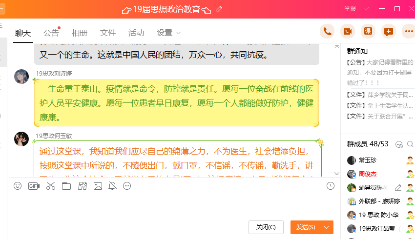 19思政陈玉玲:庚子新年,突如其来的新型冠状病毒使全国各族人民面对着一场没有硝烟的疫情阻击战。疫情就是命令,防控就是责任。信心和毅力是战胜一切艰难险阻的力量源泉。面对当前抗击疫情的严峻形势,党员干部更要坚定信心,坚强毅力,把人民群众生命安全和身体健康放在第一位,强化担当意识,砥砺奋斗意志,紧紧依靠人民群众,始终坚持科学防控,坚决打赢这场疫情防控阻击战。