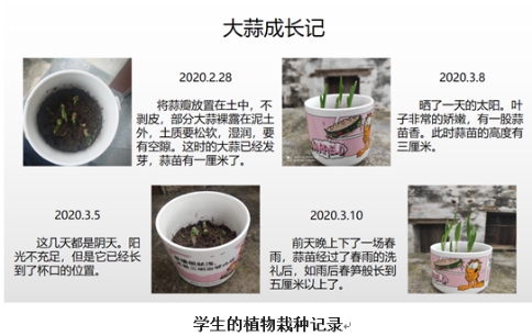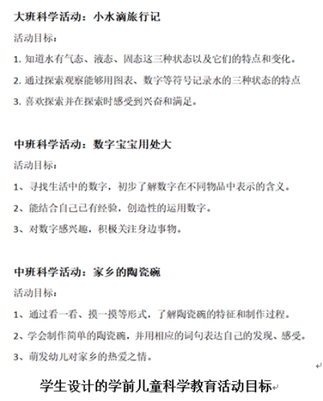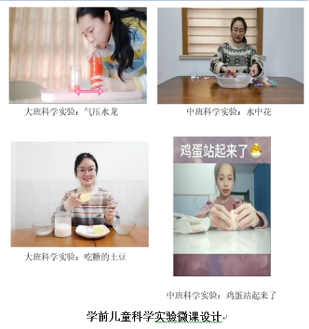 为保证在线教学的有效开展,加强线上教学的针对性,发展学生的实践能力,老师们相继组织实施课程实践项目。学前儿童活动设计课程开展了“幼儿园教育工作周计划”设计,模拟学生在园的教学状态。学前儿童科学教育课程更是开展多种实践教学,如栽种植物并做好观察记录、科学实验微课设计、学前儿童科学玩教具制作,结合《幼儿园指导纲要》和《3-6岁儿童与发展指南》以及家乡特色资源设计科学教育目标与内容等。这些实践项目不仅加深了学生对理论知识的理解和消化,还促进了职业技能的掌握,更激发了学生学以致用、大胆创新的学习积极性和主动性。