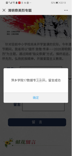 目前受新冠肺炎疫情影响,学生未返校,也不宜开展聚集活动,本次活动中信计学院全体学生和党员以网络“指尖祭奠”的方式开展,通过江西省文明办和萍乡市文明办等单位开设的网络平台,以线上留言和虚拟致敬、献花等形式,表达对英烈的缅怀和致敬,传承红色基因。