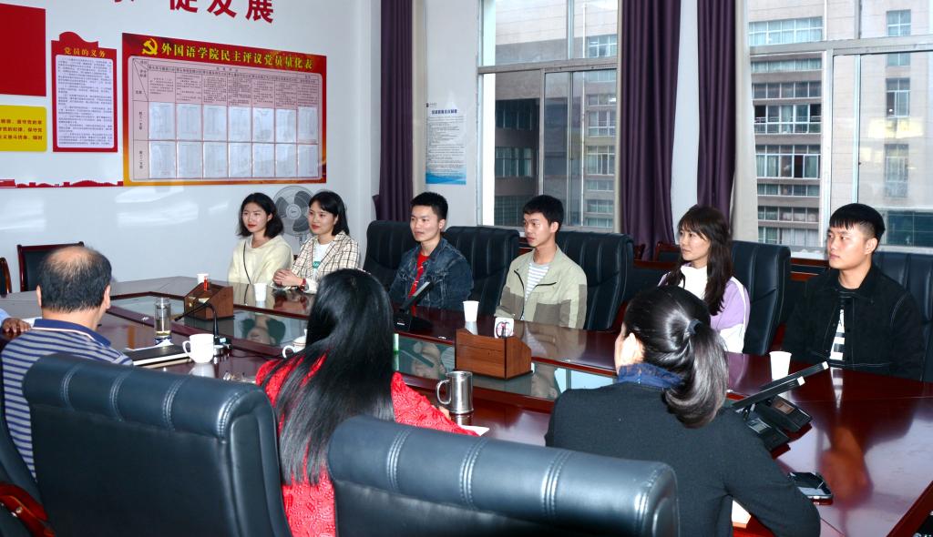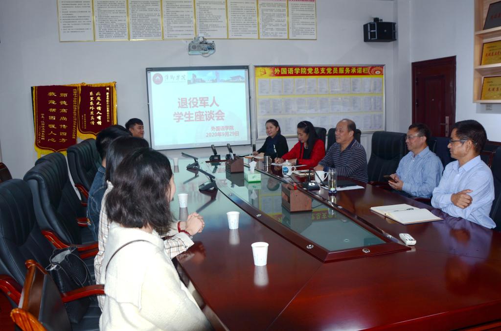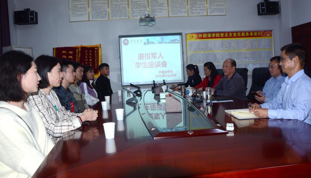 为进一步做好退役军人复学学生学习、生活服务工作,发挥他们忠诚、担当模范作用。2020年9月29日下午在英华楼3319会议室召开“退役军人座谈会”。校党委副书记蔡宝琦、院党总支书记黄柏萍、院长欧阳咏梅、院党总支副书记刘佳萍、副院长卓玲及外国语学院退伍军人参加。