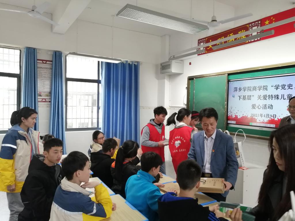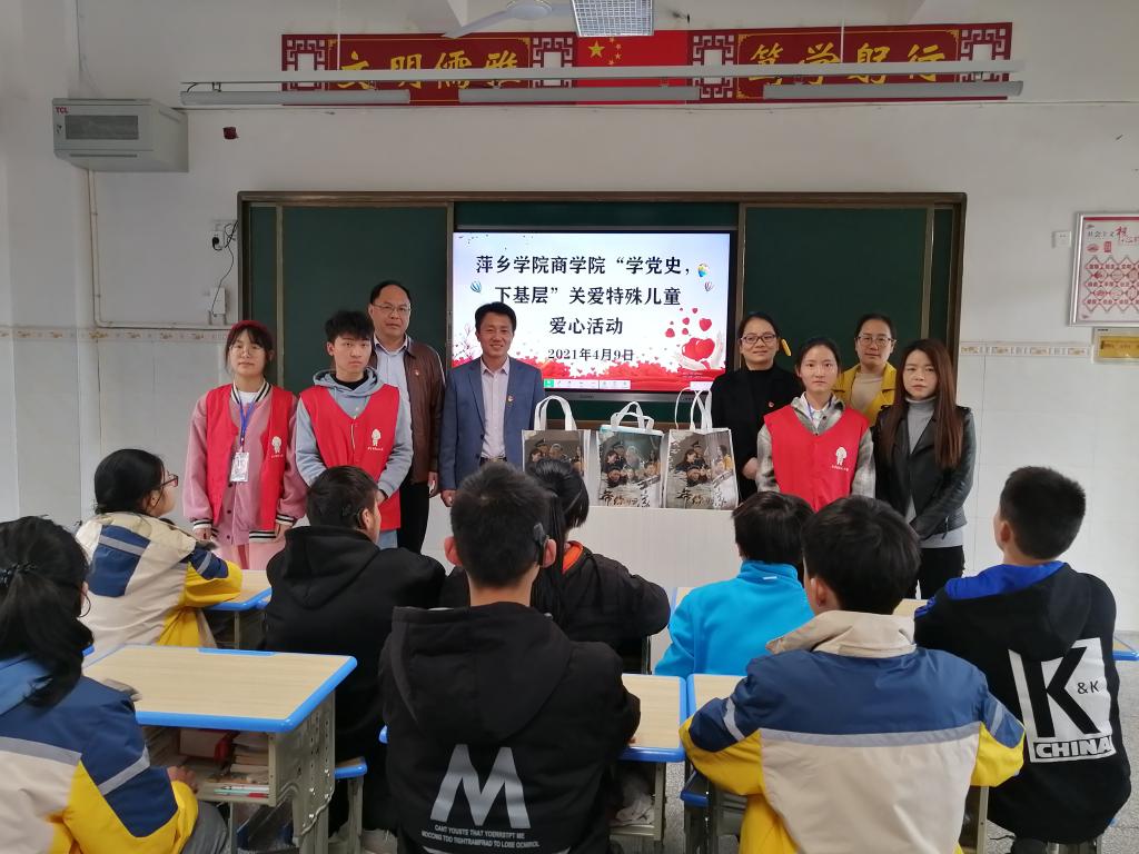 2021年4月9日下午,商学院党总支书记曾敏一行赴芦溪特校组织开展“学党史,下基层,关爱特殊儿童”志愿服务活动,实地考察beat365正版唯一官网义工团志愿服务定点合作单位,现场完成特殊儿童的微心愿。商学院及义工团师生代表共计10人参加此次活动。