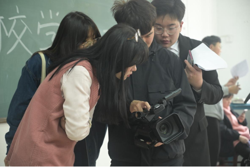 本次活动正式拍摄由摄像组的三台固定机位和两个移动机位进行,固定机位与移动机位相互配合,根据策划组的分镜头脚本有序进行拍摄。拍摄现场,教师易茜解决学生存在问题,指导工作;各小组相关人员各司其职,团结协作,活动展开非常顺利。