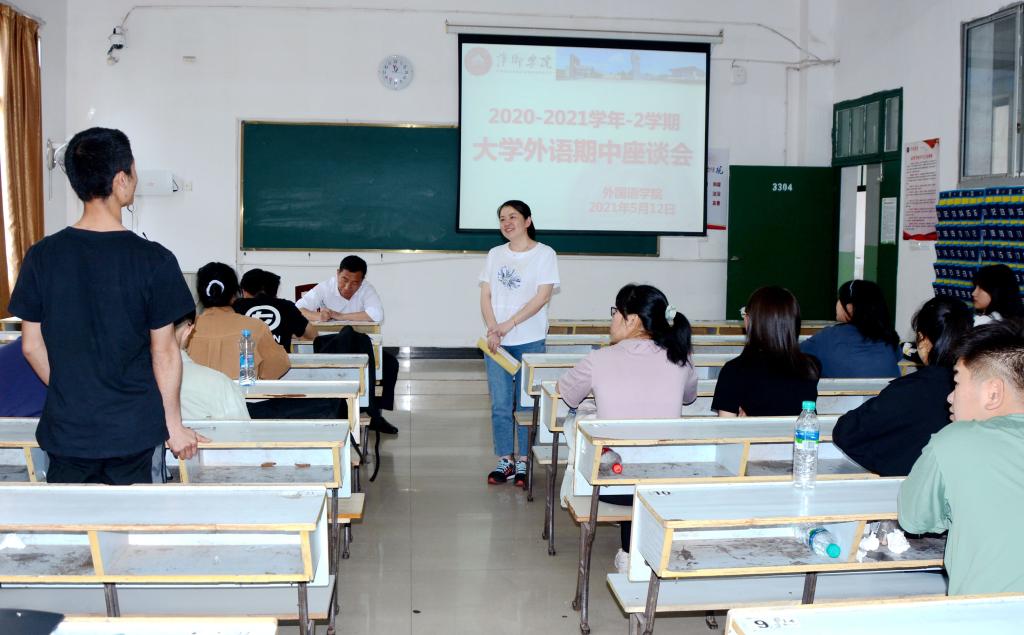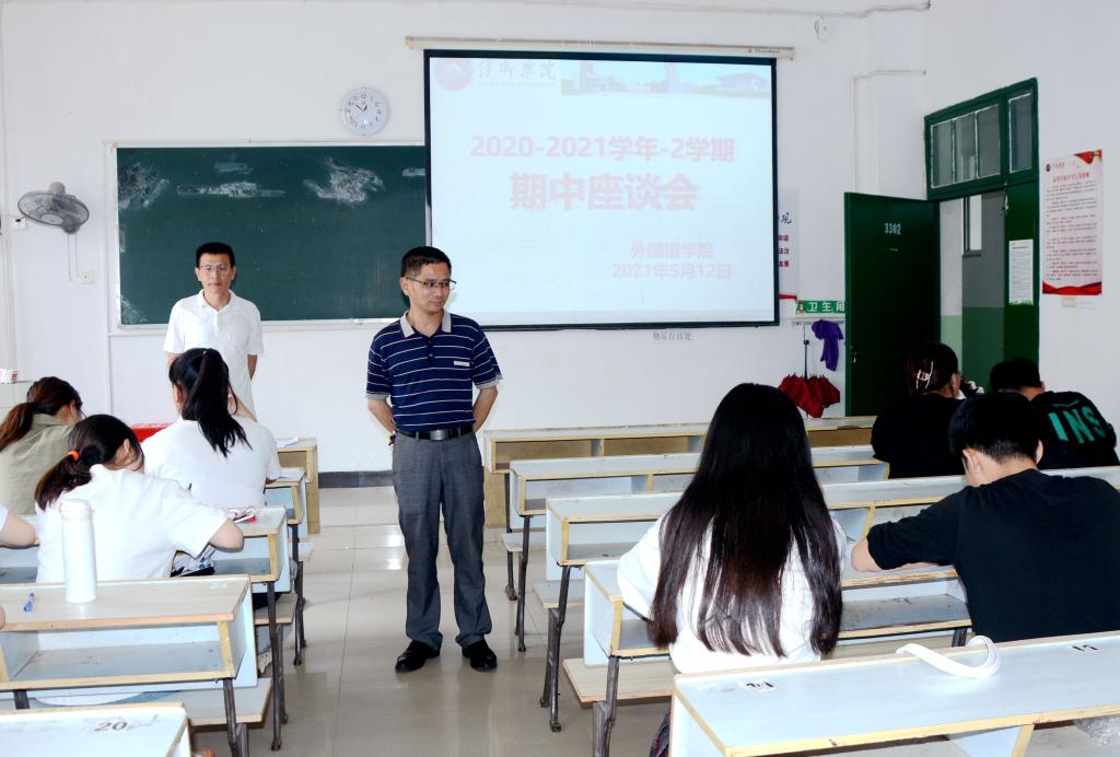 为了全面了解外国语学院及全校外语教学工作状态,加强和规范教学管理,进一步贯彻落实我院党史学习教育,开展好“我为师生办实事”实践活动。外国语学院于5月12日中午在英华楼分专业、分场地召开了2020-2021学年第二学期期中学生座谈会。院党政领导班子、各教研室主任及各专业学生代表等参加了座谈会议。