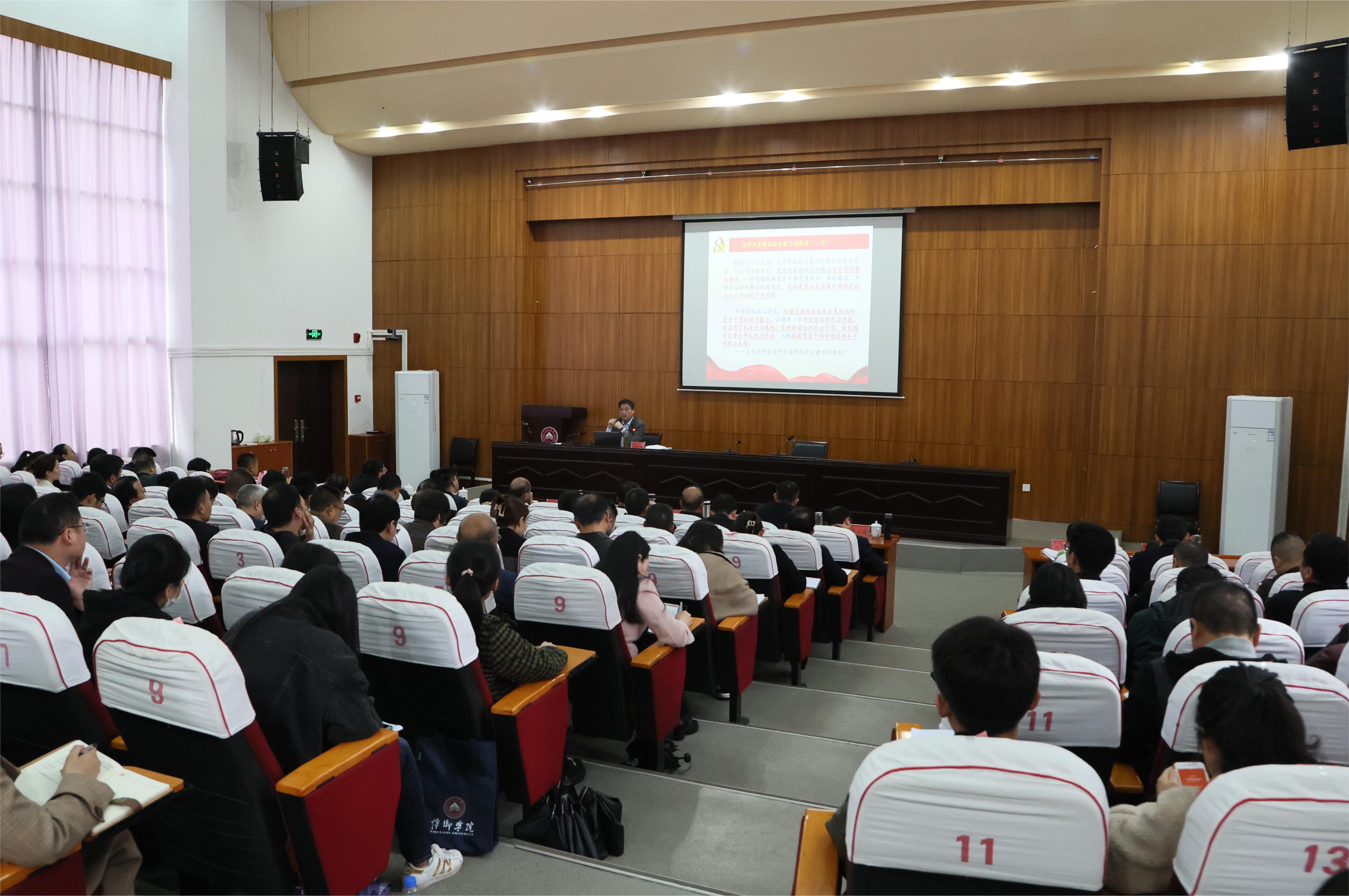 邱晓辉围绕习近平总书记关于党的政治建设的重要论述,以“加强党的政治建设,提高政治判断力、政治领悟力、政治执行力——学习贯彻习近平总书记关于党的政治建设重要论述”为题,从“如何理解政治能力和政治“三力’”“为什么要提高政治能力和政治“‘三力’”“如何提高政治判断力、政治领悟力、政治执行力?”三个方面,深刻阐述了加强党的政治建设的重要性和提高各级党组织和党员干部政治判断力、政治领悟力、政治执行力的重要意义。他指出,政治判断力、政治领悟力、政治执行力是一个相互关联的有机整体。政治判断力是明是非,强调预见性和鉴别力,是能力体系中辨别政治是非、把握政治主动的重要前提,是核心;政治领悟力是抓重点,强调敏锐性和洞察力,是能力体系中的基础;政治执行力是看行动,强调坚定性和行动力,是能力体系中的关键和保证。他表示,要强化理论武装、要心怀“国之大者”、要站稳人民立场,坚持和加强党对学校工作的全面领导,在办学治校各领域、教育教学各环节全面落地落实落细。要聚焦人才培养核心,牢记立德树人初心使命,以党建引领立德树人,把握正确方向,彰显组织优势,弘扬红色传统,夯实制度保障,营造立德树人清正生态。要练就过硬真本领,牢牢把握工作主动权,加强政治理论和专业化学习,以过硬的能力抢抓发展机遇、赢得战略主动。增强政治意识提高政治能力必须严以律己,必须对党的政治纪律和政治规矩怀有敬畏之心,要在思想淬炼、政治历练、实践锻炼、专业训练中不断提高政治判断力、政治领悟力、政治执行力。
