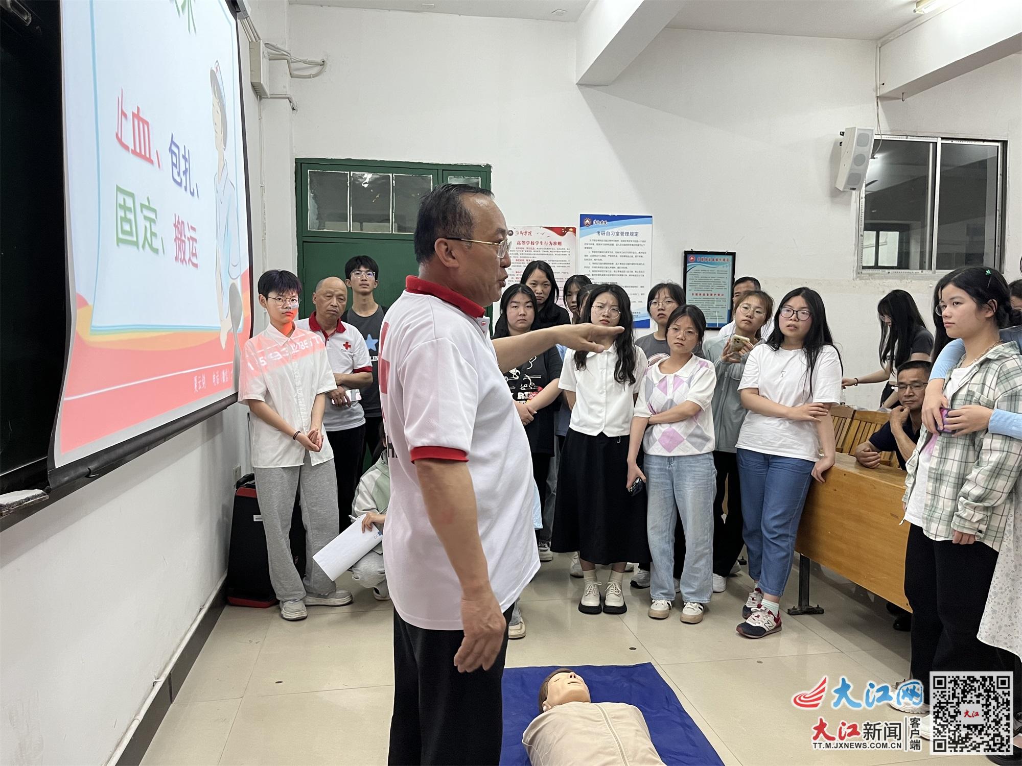 讲座结束后,夏云剑带领学生们利用人体模型进行了心肺复苏和创伤救护的实操演练。同学们聚精会神,进行学习操作。