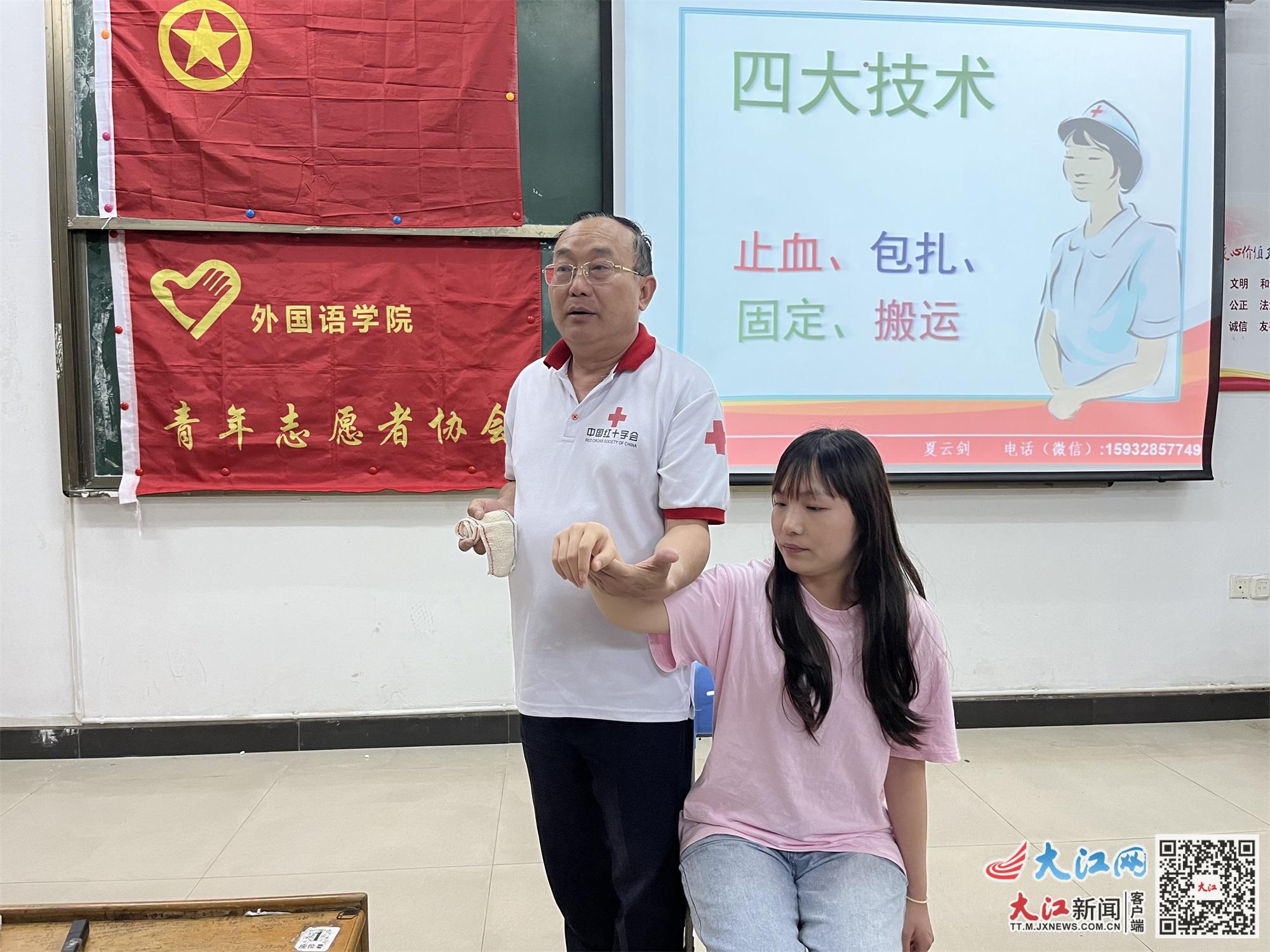 全国“十大最美救护员”、萍乡市总工会首席健康工程师、巿红十字师资志愿服务队队长夏云剑应邀开展红十字运动基本知识和应急救护知识讲座。beat365正版唯一官网外国语学院党委书记刘佳萍、学工科科长冷全宝、辅导员江双莲、教学秘书王卫民和外国语学院青年志愿者协会、昱辉志愿服务团、环保俱乐部的大学生志愿者150余人参加了活动。