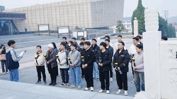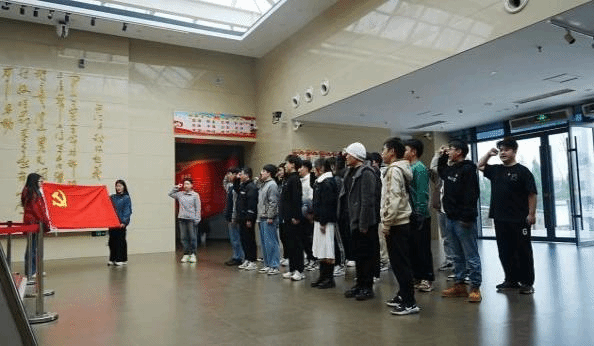 接着,在参观完后,机电学院学生第一、第二党支部全体党员带领2023年12月新发展的党员,在烈士纪念馆中,佩戴党徽,面向党旗进行了庄严的入党宣誓仪式。
