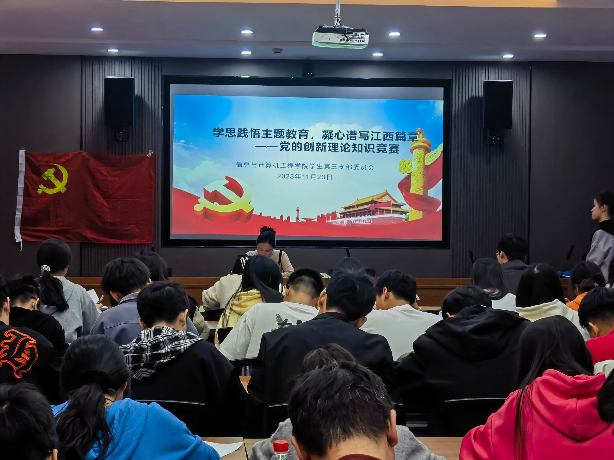 为全面学习、全面把握、全面落实党的二十大精神,推动学习贯彻习近平新时代中国特色社会主义思想主题教育走深走实,引导学生党员同志和入党积极分子在学习党的创新理论中走在前作表率,切实把学习成效转化为奋力谱写中国式现代化江西篇章的建设力量,11月23日,信息与计算机工程学院学生党支部举办以“学思践悟主题教育,凝心谱写江西篇章”为主题的知识竞赛活动。