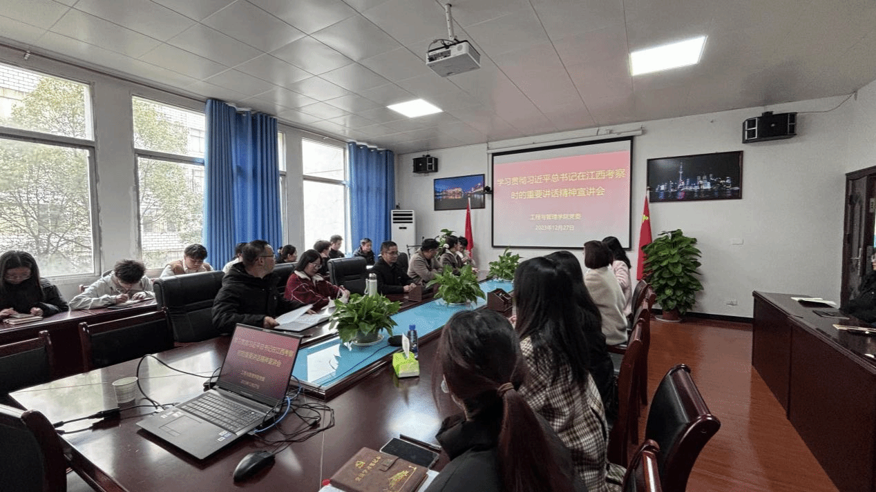 12月27日下午2:30,为深入学习贯彻习近平总书记考察江西重要讲话精神,切实把学院全体师生的思想和行动统一到总书记的重要讲话精神上来,推动学院十四五高质量发展。根据校党委的统一安排部署,宣讲团成员、外国语学院党委书记刘佳萍同志来到工程与管理学院进行宣讲。宣讲会由工程与管理学院党委书记彭友花同志主持,参加宣讲会的有学院班子成员、党员、教师、入党积极分子和学生代表,宣讲地点为英华楼3229会议室。