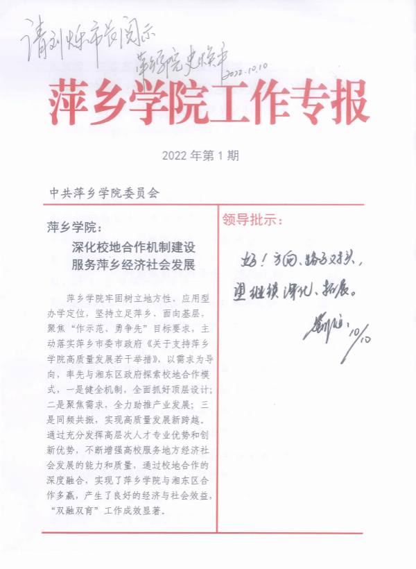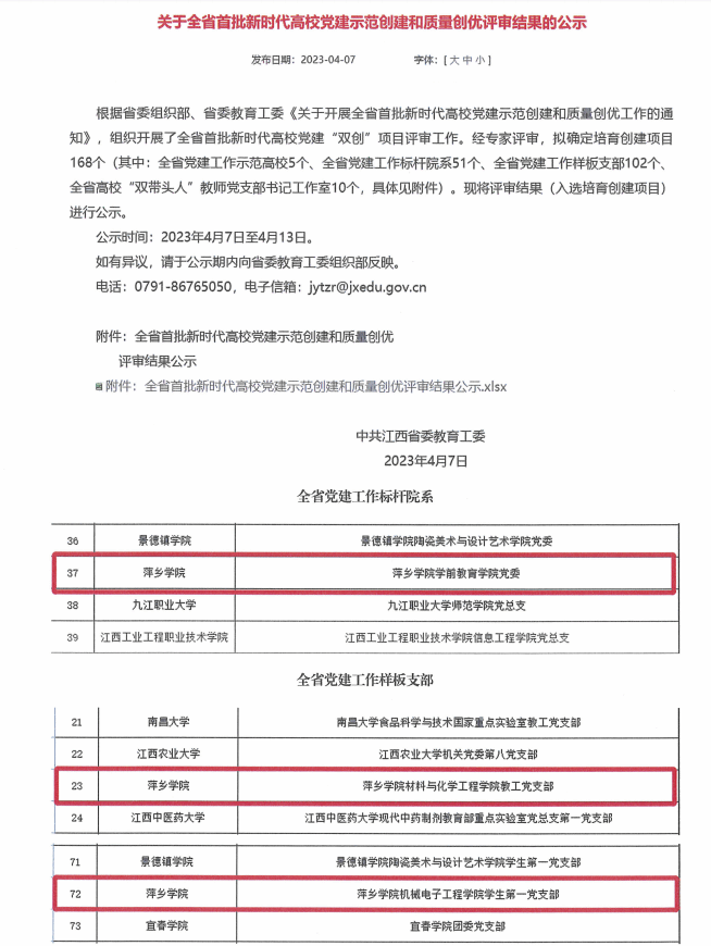 获批1个全省党建工作标杆院系、2个全省党建工作样板支部;获全省党务技能大赛二等奖1个;1人当选省第十五次党代会代表;3个党组织和7名党员获江西省、省教育系统及萍乡市“两优一先”表彰;精准扶贫与乡村振兴工作连续8年获省委组织部与省乡村振兴局评为好等次;学校获全省关心下一代工作“先进集体”,1人获全国关心下一代工作“先进个人”,1人获全国三八红旗手,8人获省年度考核优秀干部,8人获市年度考核优秀干部被嘉奖。高层次人才服务团服务地方经济社会发展有关经验得到省市领导肯定,其做法在《江西教育工作情况》全文刊登,并在全省宣传。