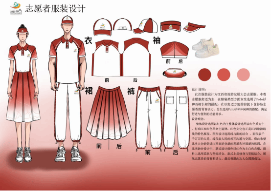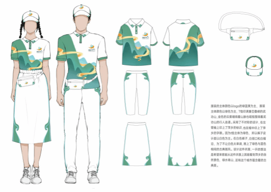 此次志愿者服装设计聚焦“中国新旅游、萍乡正青春”主题,beat365官网师生团队精心谋划、精致打造、精美呈现,组织师生团队共计设计30余套具有萍乡地域特色的志愿者服装。经过反复打磨与修改,最终选定两套作品作为旅发大会志愿者服装,一套以武功山绿色旅游为主题,用于武功山分会场,主体颜色以绿色为主,T恤印满重峦叠嶂的武功山,金色的云雾缠绕着武功山,反映出“观日景如金在冶,游人履步彩云间”的美丽风光;另外一套以彰显安源红色文化为主,用于安源分会场,款式设计颜色以红色为主白色点缀,面料上选用柔软与坚挺结合,款式上是修身与坚挺结合,展现志愿者的青春和活力。